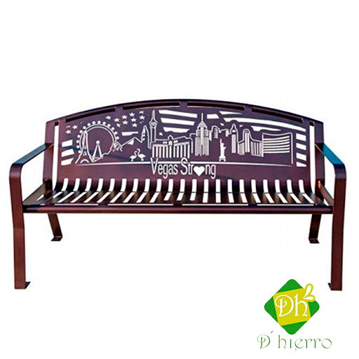 Banca metálica a base de acero al carbón en corte laser, marca "D'hierro" modelo ZAC-10, con acabado en pintura electrostática en polvo horneada de alta resistencia a la intemperie, con pretratamiento de fosfato de zinc para anclar o ahogar en concreto.