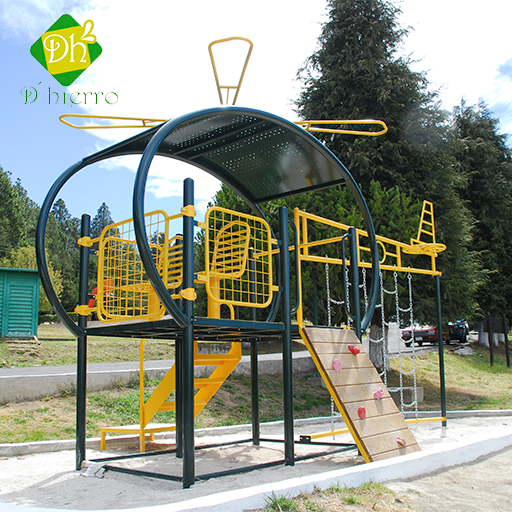 Multijuego infantil marca d'hierro, modelo hlp-05 incluye: helicóptero temático con 1 trepador de madera, escalador de madera, 2 asientos y 1 escalera, acabado en pintura electrostática en polvo horneada de alta resistencia a la intemperie, con pretratamiento de fosfato de zinc, para anclar o ahogar en concreto.